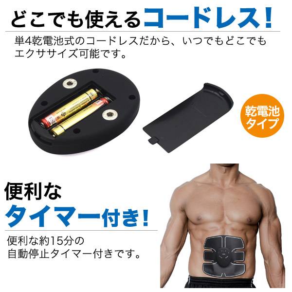 鍛えたい部位に貼るだけで簡単にエクササイズ! 電池式腹筋用EMSエクササイズパッド+腕・脚用EMSエクササイズパッド×2 全身をエクササイズできるお得な3点セット 鍛えたい部位に貼るだけで簡単にエクササイズできる、EMSエクササイズパッド! 家事やテレビを見ている時など、ちょっとした時間にエクササイズできます。
